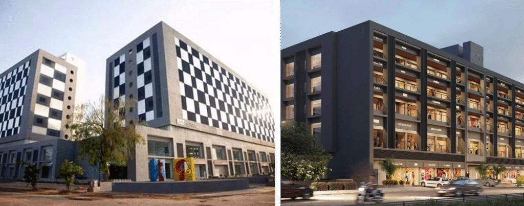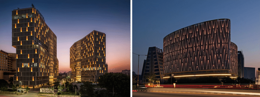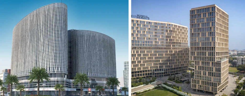 Mondeal Square & Mondeal Heights both use facades inspired by Sidi Saiyyed’s iconic Jali, a historical design identity of Ahmedabad.