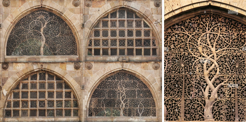An image of the Jali at Sidi Saiyyed Mosque that uses a traditional lattice screen design for both aesthetic appeal and climate control.